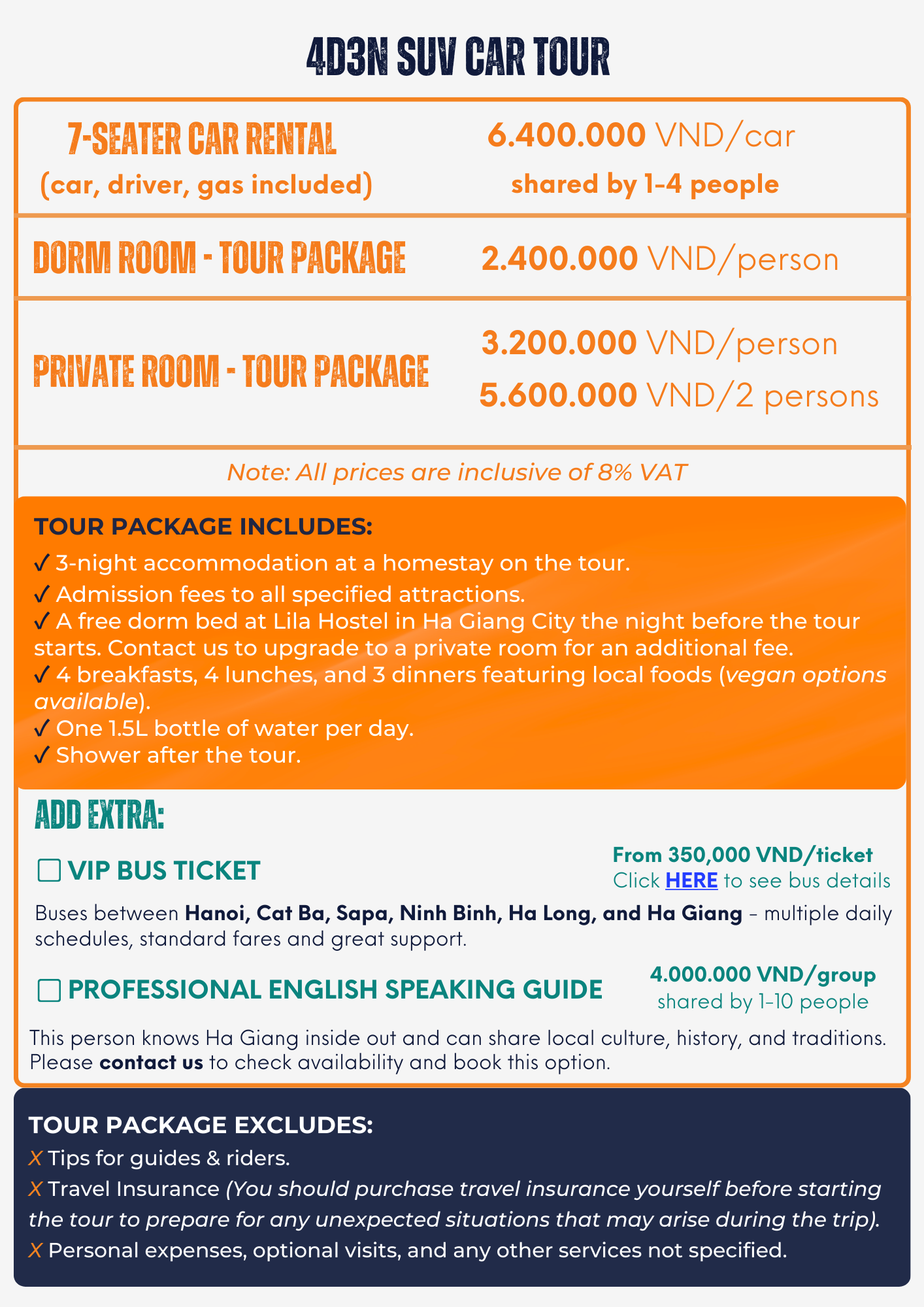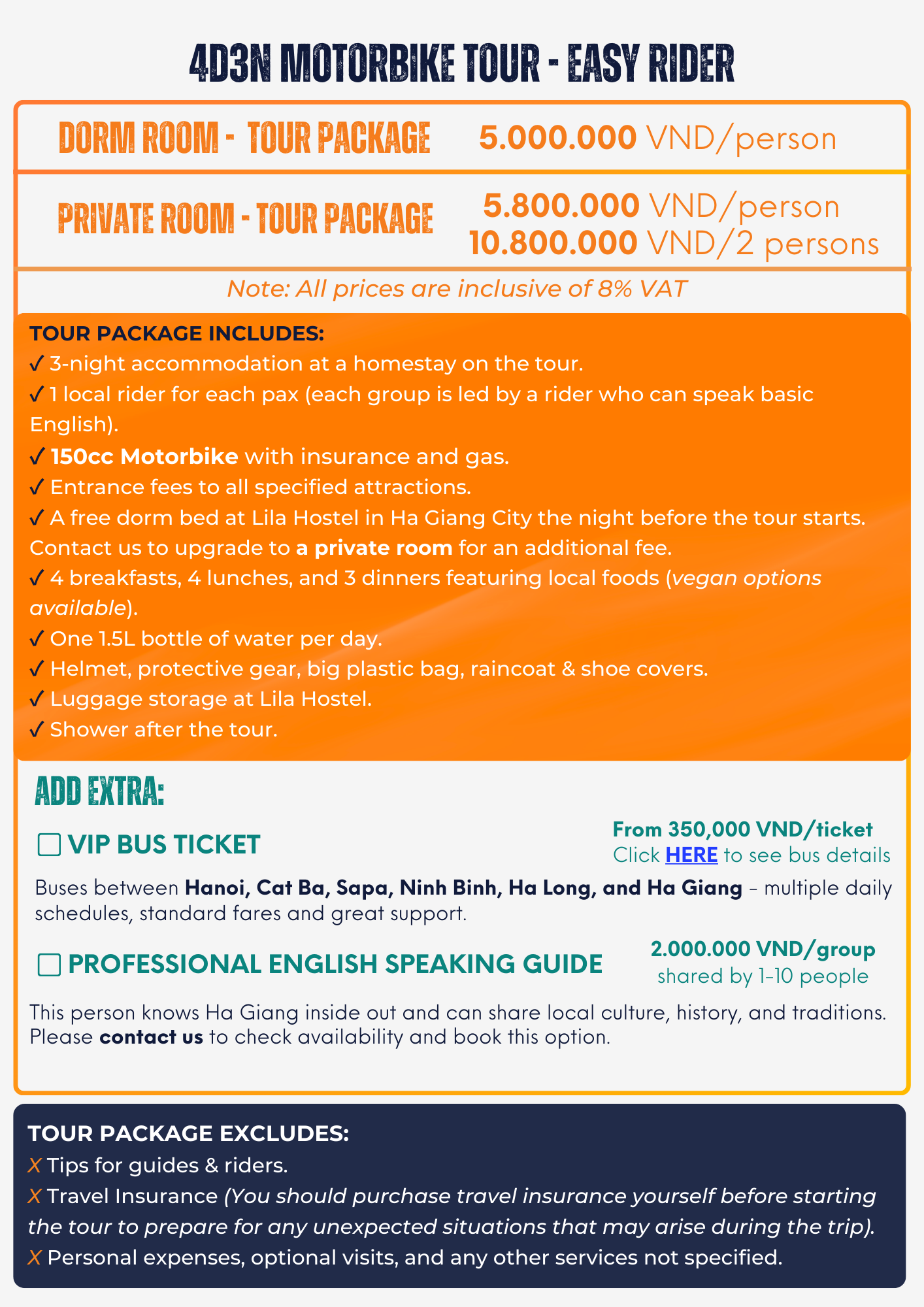 Overview: 90% of travelers have told us that they want to experience Ha Giang beyond the usual highlights and most of them choose the 4-day tour with Lila Inn & Tours. Why? Because you’ll conquer all the classic spots from Ma Pi Leng Pass to Nho Que River, then dive deeper into Ha Giang’s wild side: visit the Northernmost Point of Vietnam, meet the Lo Lo people in their hidden mountain village, raft along the serene Du Gia Bamboo River, cool off at Ban An Stream, and explore the mysterious Tham Lin Cave. This is the Ha Giang tour at its most authentic, immersive, and unforgettable.