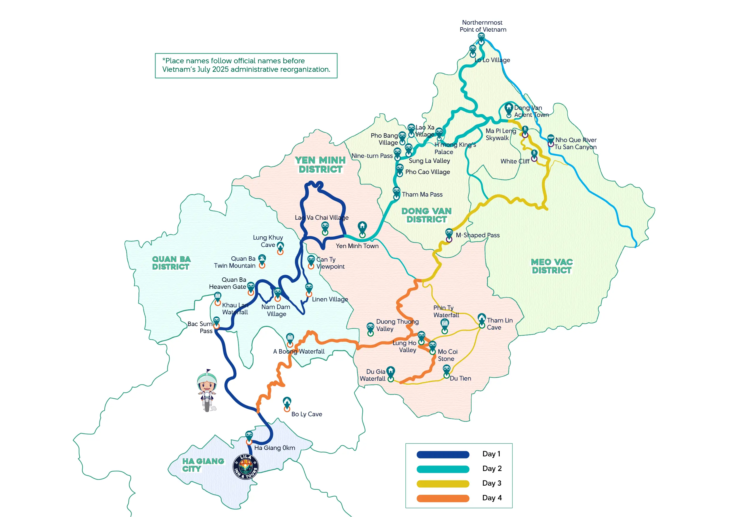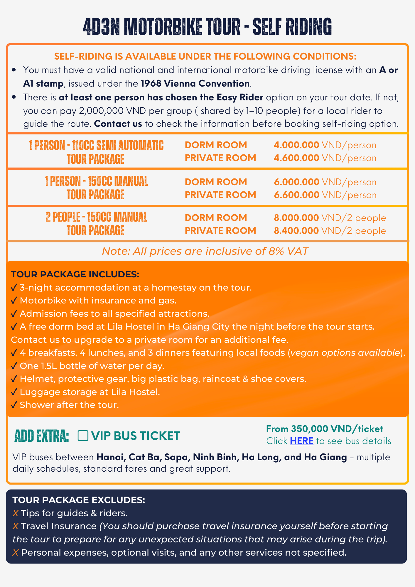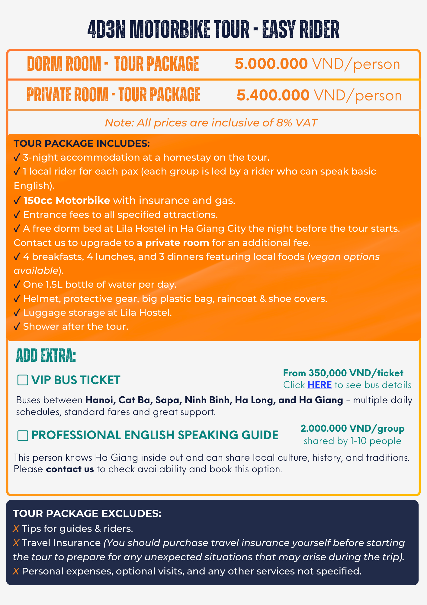 Overview: 90% of travelers have told us that they want to experience Ha Giang beyond the usual highlights and most of them choose the 4-day tour with Lila Inn & Tours. Why? Because you’ll conquer all the classic spots from Ma Pi Leng Pass to Nho Que River, then dive deeper into Ha Giang’s wild side: visit the Northernmost Point of Vietnam, meet the Lo Lo people in their hidden mountain village, raft along the serene Du Gia Bamboo River, cool off at Ban An Stream, and explore the mysterious Tham Lin Cave. This is the Ha Giang tour at its most authentic, immersive, and unforgettable.