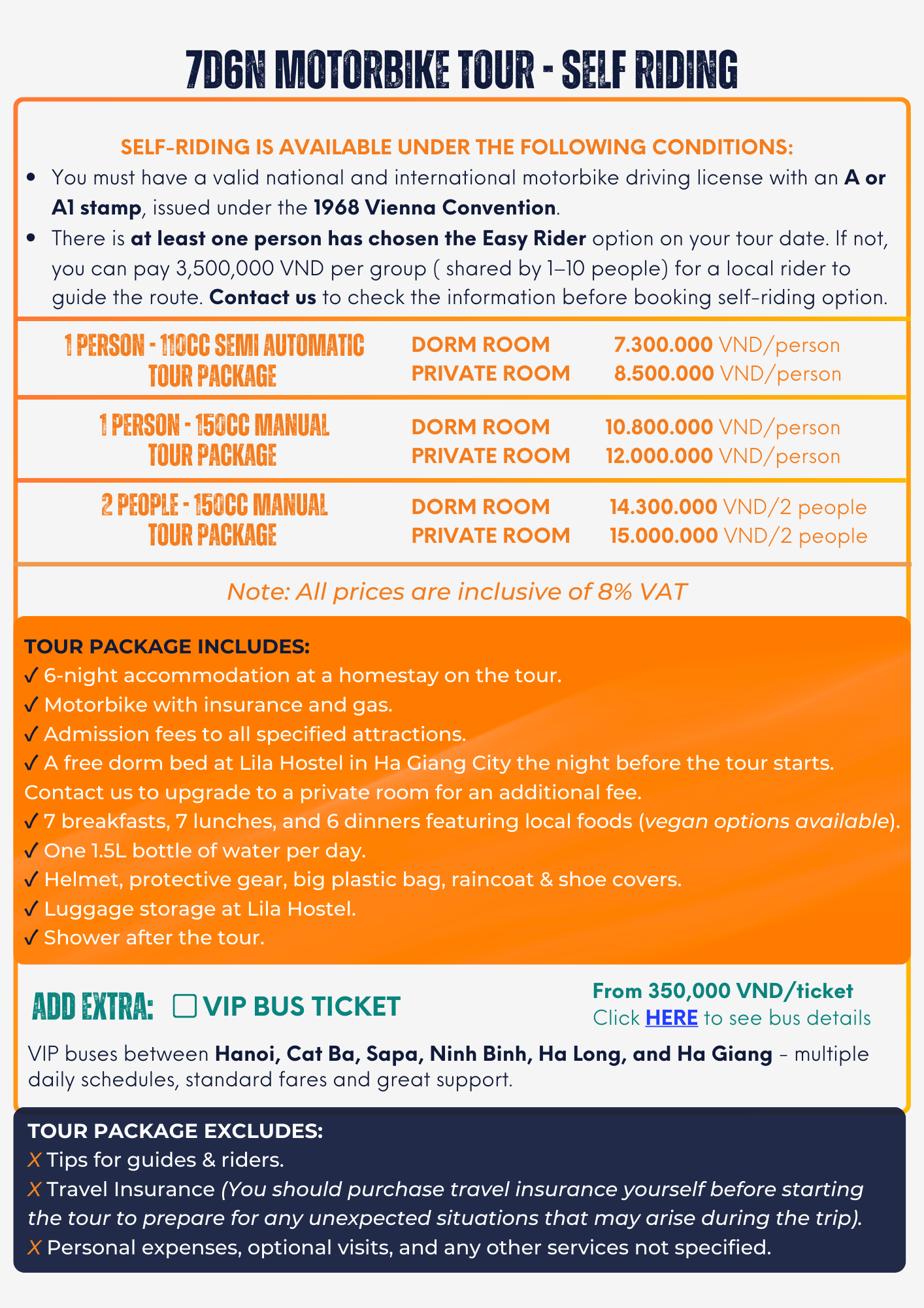 Overview: Ever wondered what a full week of Vietnam’s wildest north feels like? This 7-day Ha Giang Loop – Cao Bang Tour with Lila Inn & Tours takes you far beyond the familiar loop. Ride through classic highland passes in Ha Giang, then press on into the remote valleys of Bao Lac and Cao Bang—cross the Khau Coc Cha Pass, float on the Quay Son River, marvel at the spectacular Ban Gioc Waterfall, explore the deep caves of Nguom Ngao Cave, and wind your way to the tranquil waters of Ba Be Lake for a boat ride among limestone karsts. With intimate homestays, local guides, and hidden-gem detours—this is Northern Vietnam in its rawest, richest form.