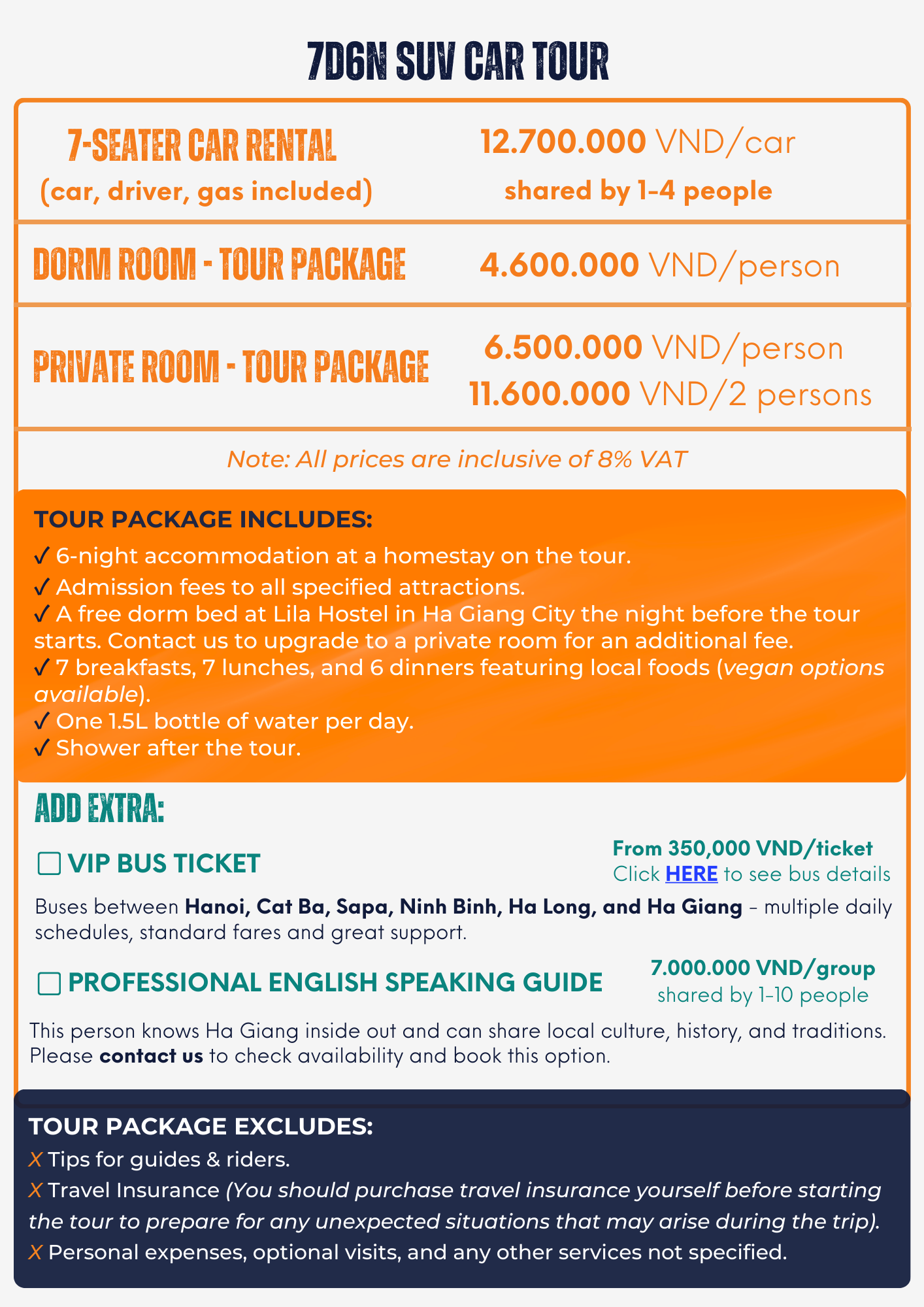 Overview: Ever wondered what a full week of Vietnam’s wildest north feels like? This 7-day Ha Giang Loop – Cao Bang Tour with Lila Inn & Tours takes you far beyond the familiar loop. Ride through classic highland passes in Ha Giang, then press on into the remote valleys of Bao Lac and Cao Bang—cross the Khau Coc Cha Pass, float on the Quay Son River, marvel at the spectacular Ban Gioc Waterfall, explore the deep caves of Nguom Ngao Cave, and wind your way to the tranquil waters of Ba Be Lake for a boat ride among limestone karsts. With intimate homestays, local guides, and hidden-gem detours—this is Northern Vietnam in its rawest, richest form.