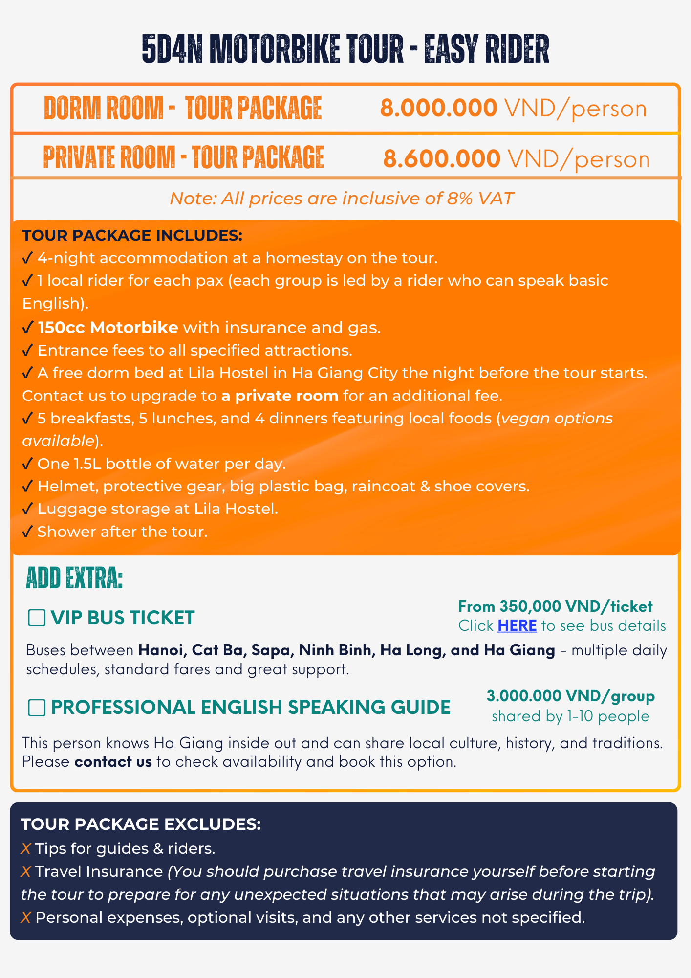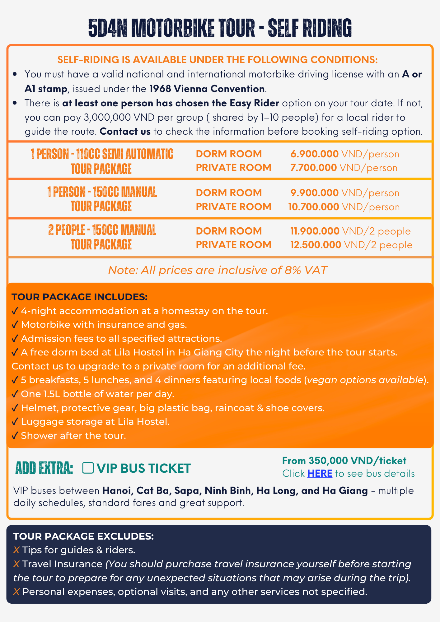 Overview: Some of you may have heard of Cao Bang – an emerging hidden gem in Vietnam. Lila Inn & Tours offers a 5-day journey through both Ha Giang and Cao Bang for an expressive and unforgettable experience. Sound compelling? It is. This 5-day adventure leads you to Ha Giang’s iconic spots from Dong Van UNESCO Karst Plateau, Ma Pi Leng Pass to Nho Que River; wind along the dramatic Cao Bang’s Khau Coc Cha Pass, roam around the peaceful Ngoc Con Valley, and stand in awe of the majestic Ban Gioc Waterfall and more. It’s the relaxing and immersive journey for true explorers of the Northernmost.